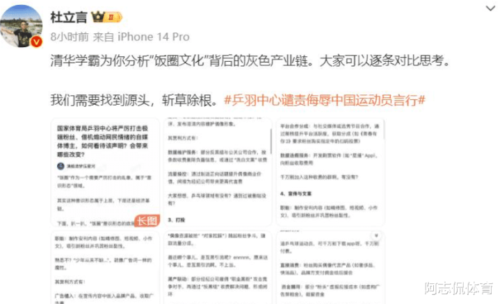 对此不少媒体人都在社交平台上发声,饭圈文化背后其实有会很大的灰色产业链,而且这些人都有固定的收入和渠道,其中就包含了负责拍摄偶像的公开或者非公开照片;运营粉丝站,为偶像专职监测网络舆论,组织粉丝为偶像刷数据、投票;热搜和播放量,制作一些精修图;还有应援集资投广告。这些球迷当中其中不外乎有真正的球迷,但是也有被饭圈文化所利用的,毕竟运动员不是明星,他们真正的舞台是在竞技场上是要为国争光的,而现在却严重受到饭圈文化的侵蚀,严重影响运动员的身心健康,现在急需要去饭圈化。