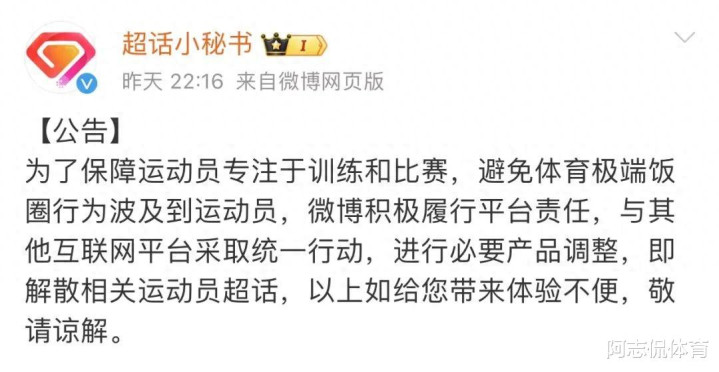 对此体育总局重拳出击,据悉在2月27日晚间的微博超话小秘书发布公告,避免体育极端饭圈化,解散了相关运动员的超话,其中包括国乒全部运动员,像孙颖莎、王曼昱、王楚钦、马龙、樊振东。还有跳水的全红婵、陈芋汐,以及游泳队的张雨霏,王昶等诸多流量运动员。